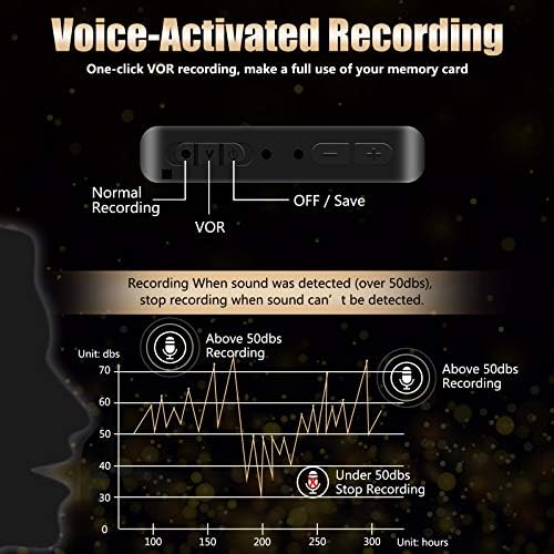 【Voice-Activated Recording】One-click recording make you begin recording rapidly. Push the change to the “VOR”(center) place to start out Voice-active recording which is able to recording when sound was detected(over 50dbs), in any other case will cease recording to make sure full use of the reminiscence. Push the change to the “On” place to start out regular recording. Push to the “Off” place to avoid wasting the recording file.