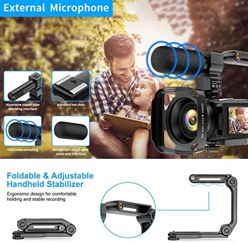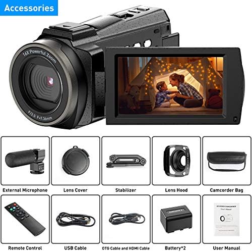 1 x Digital 4K video digital camera Camcorder, 1 x Handheld Stabilizer, 1 x Exterior microphone, 1 x Lens cowl, 1 x Lens Hood, 1 x HDMI Cable, 1 x USB Cable, 1 x OTG Cable, 1 x Distant management, 1 x Camcorder bag, 1 x Consumer Guide, 2 x Rechargeable Lithium batteries