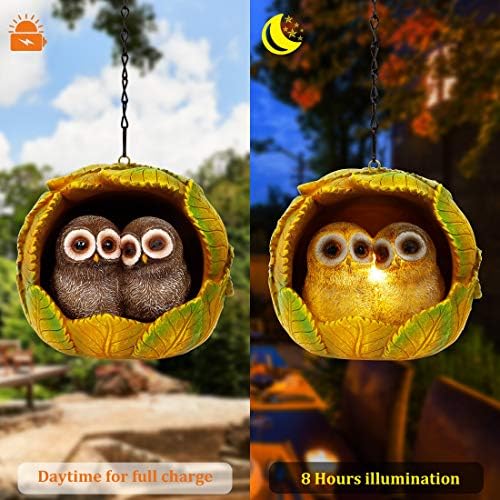 Cute Design – OurHanging Photo voltaic Lights is 2 owls in a nest wrapped in leaves. The nest made up of leaves is kind of modern, which is matched with two wide-eyed owls. The photo voltaic cells above the pendant have a really lengthy life and are environmentally pleasant and vitality environment friendly. They will retailer vitality throughout sunny hours to be lit up within the absence of daylight.