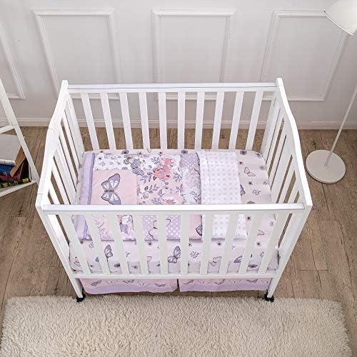 DIMENSIONS: This mattress set features a 24 x 38 inch fitted mini crib sheet with 5 inch deep pockets for moveable crib mattresses, a 30 x 38 inch quilted comforter, and a mud ruffle skirt that measures 24 x 38 inches with a ten inch drop.