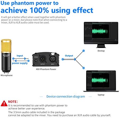 *PLEASE NOTE: Sound Card, 48V Phantom Energy, 1/4″ to XLR Cable & XLR to XLR Cable are wanted to buy moreover.* NOTE: 1.The Condenser Microphone solely works with the gadget that would present sufficient energy(Voltage Required:5V) for it. When related with desktop pc, the Microphone might be used alone; When related with laptop computer pc, please join the laptop computer to electrical outlet,or use a 48V phantom energy to get sufficient energy if the sound is just not clear and excessive sufficient. 2.In case your gadget couldn’t present sufficient energy(when used with Amplifier or Mixer, and so forth.), the sound quantity recorded is likely to be low, and please use a additional 48V phantom energy adapter to attach it. 3.The microphone can’t be used with cell phone and pill pc. NOTE: It can’t work with Mac. 4.If you’d like higher sound impact, a sound card ought to be used. 5.When recording, please put the microphone away from the amplifier to forestall recording noise because of amplifier. (1)NW-800 Skilled Condenser Microphone: Trendy design. Noble and chic look.Sturdy and sturdy. Physique weight: 11oz/316g Coloration: Black Materials: Steel (1)NW-35 Scissor Arm Stand: *Max load: Approx 35oz / 1KG* Double-braced arms geared up with super-strong spring. Materials: Metal Prolong as much as Approx.31.5″/80cm. (1)Microphone Pop Filter (1)Steel Shock Mount (1)Ball-type Foam Cap (1)Desk Mounting Clamp (1)3.5mm Male to XLR Feminine Cable: Size: Approx. 8.2ft/2.5m