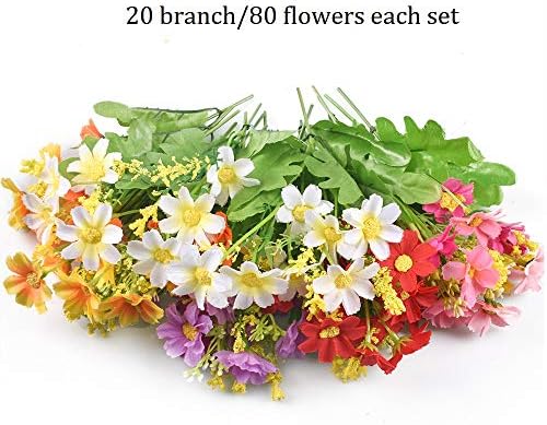 Synthetic daisy product of silk, plastic stem. 20 branches/ 80 flowers every set, usually include 4-6 random vivid colours, colours could differ in each cargo.Bundle include 20 small ladybugs in whole, the approx. size is 1.1cm/0.43inchAfter obtain the product, please stick ladybugs on the wooden fence or synthetic daisy, to create actual impact, make these flowers extra lovely.