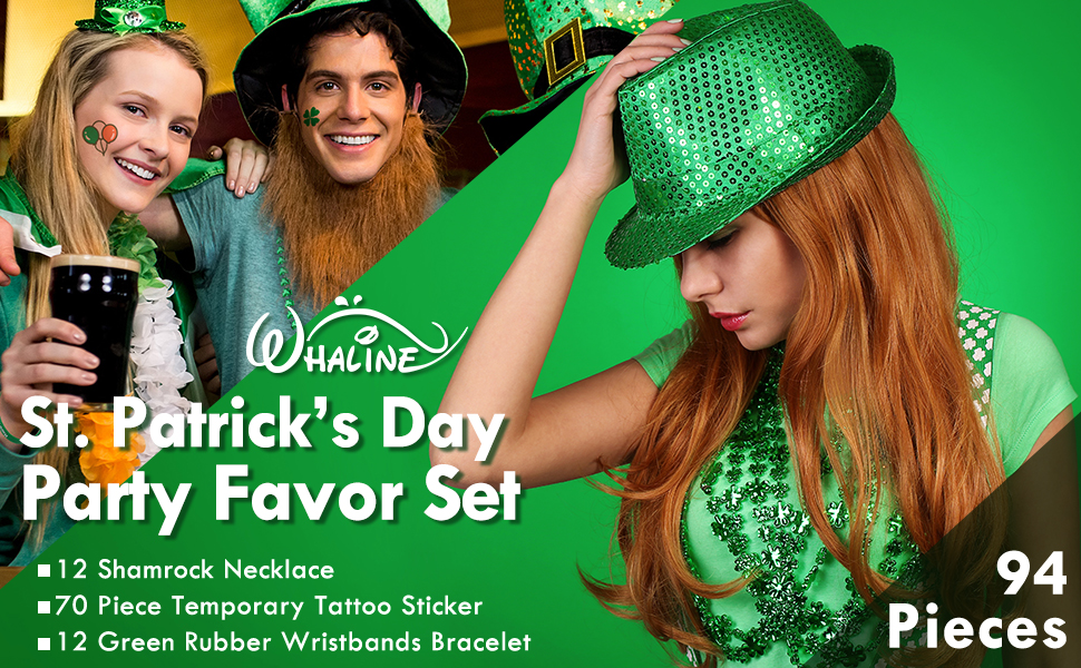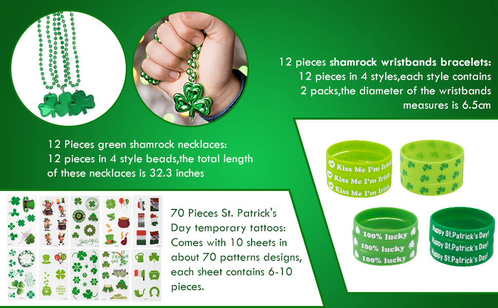 3 x shamrock eyeglasses,3 x inexperienced shamrock headbands,20 x inexperienced cash,72 x short-term tattoo decals,12 x mustaches,4 x glitter inexperienced necklace,6 x fortunate bracelets, 6 x St. Patrick’s Day Headbands ,1 x Shamrock Necklaces ,72 x Clover Tattoo Stickers